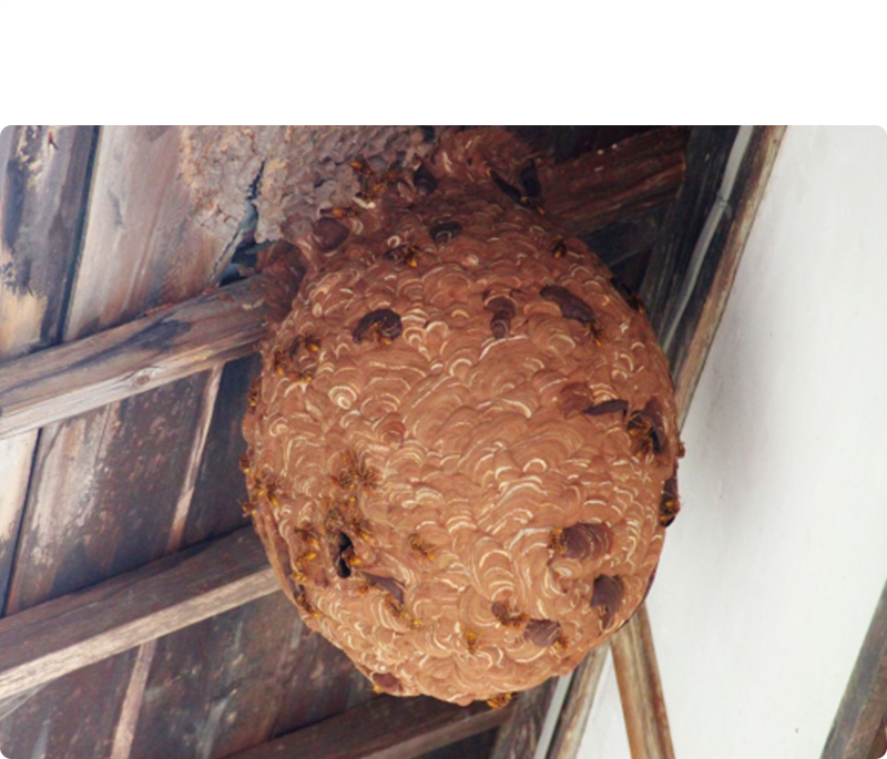 屋根裏や木の枝先、室外機の周辺などにできたハチの巣を安全に撤去し、周囲を飛び回るハチの駆除もあわせて行います。