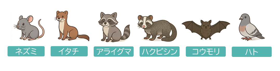 近年、ネズミ・イタチ・アライグマ・ハクビシンなどの動物による住宅被害が増加しています。
